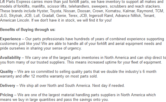 We provide you the best deals on all parts for your fleet of forklifts. Give us a call today if you are interested in getting a price quote on our attachments or parts. Our number is: